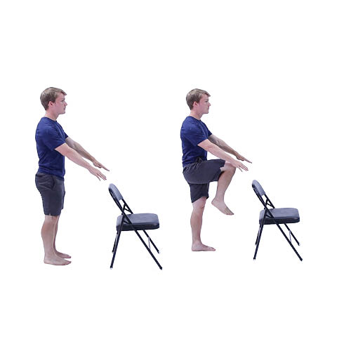 Start by standing up straight (place both hands on the back of a chair for support if needed). Slowly lift one knee up towards the ceiling until it reaches hip height and then lower it back down. Do the same with the other leg keeping the abdominals contracted the whole time. Repeat exercise 10 times.
